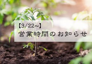 3/22(月)以降の各店営業時間をお知らせいたします。 いつも都野菜賀茂をご愛顧いただ