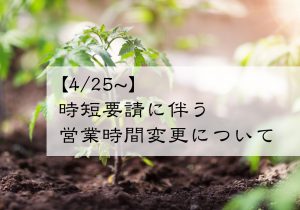いつも都野菜賀茂をご愛顧いただきありがとうございます。 当店では京都府からの時短要請に応じるため、4/5(月)〜4/21(水)の期間、下記の通り営業時間を変更いたします。 烏
