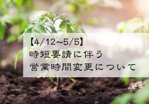 いつも都野菜賀茂をご愛顧いただきありがとうございます。京都府からの営業時短要請(まん延防止等重点措置)に応じるため、4/12(月)〜5/5(水)の期間、営業時間を下記の通り変更いたします。