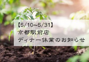 いつも都野菜賀茂をご愛顧いただきありがとうございます。京都府の緊急事態措置に応じるため、5/10(月)〜5/31(月)の期間、【京都駅前店】のディナー営業を休止いたします。 京都駅