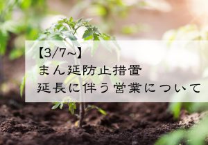 いつも都野菜賀茂をご愛顧いただきありがとうございます。京都府まん延防止等重点措置の再延長に伴い、3/7(月)〜3/21(月)の期間、営業内容・時間を以下の通りとさせていただきます。 【営業