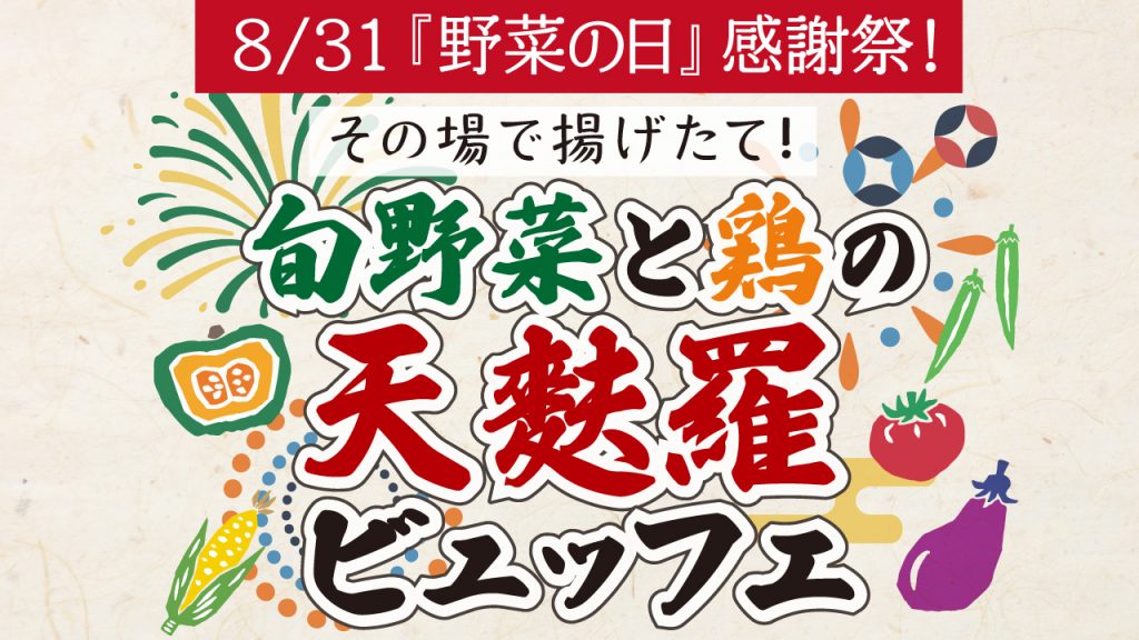 8/31に予定しております『旬野菜と鶏の天ぷらビュッフェ』につきまして、実施内容に一部追記・訂正がございますため、お知らせいたします。