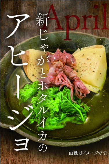 最も美味しい時期を迎える春のホタルイカと、皮まで美味しい新じゃがで、ひと味もふた味も違うアヒージョに。やみつき間違いなしの、大人のご馳走!