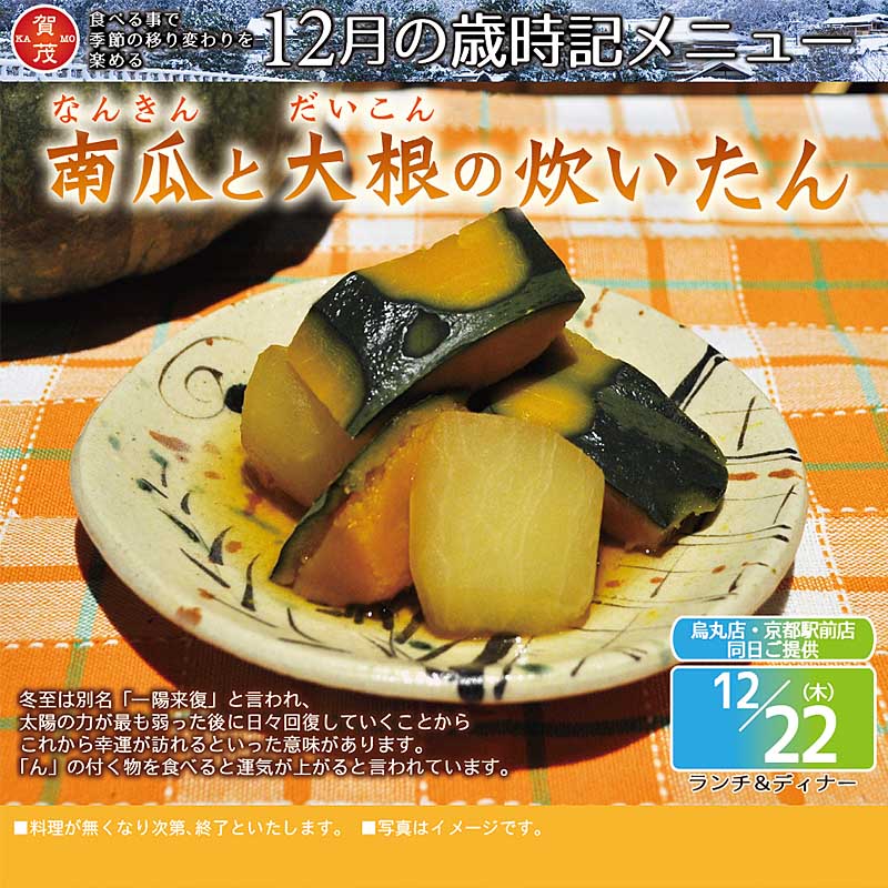 名前に「ん」の付く食材を食べると運気が上がると言われているこの日に、「なんきん」と「だいこん」の炊き合わせをご用意いたします。